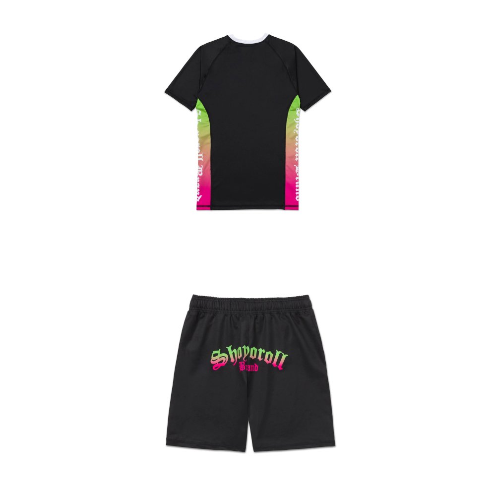 Shoyoroll Batch #149 Retro Gradient Short Sleeve Rash Guard form-fitting with flatlock stitching for BJJ training. Neutral background emphasizes the vibrant, retro-inspired design.